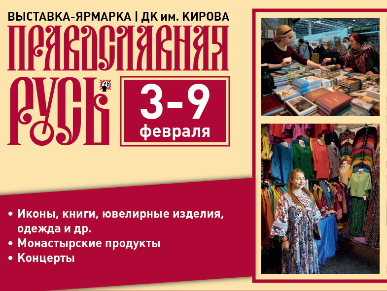 Приглашаем ознакомиться с интересной экспозицией, поклониться Святыням, получить духовную помощь, приобрести подарки для родных и близких к церковным и светским праздникам, сделать полезные и вкусные покупки на выставке-ярмарке «Православная Русь» 3 – 9 февраля 2026 г. Вход свободный! ДК им. С.М. Кирова (Санкт-Петербург, Большой пр. Васильевского Острова, 83).